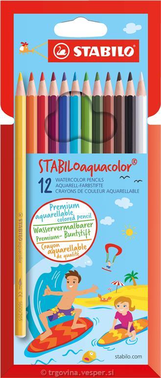 Z vrhunskimi barvnimi svinčniki STABILOaquacolor lahko ustvarite odlične vodno poslikane umetnine. Nanesene na suh papir lahko barve zmešate z malo vode in čopičem. Na vlažnem papirju se bodo barve harmonično prelile same od sebe. Z vlažnim čopičem lahko barvo poberemo tudi neposredno s konice pisala in jo prenesemo na papir. Visoko kakovostna pisala s premerom konice 2,8 mm nudijo intenzivne barve za vaša umetniška dela. STABILOaquacolor je na voljo v 36 intenzivnih barvah in je odlična izbira za vse ustvarjalne strokovnjake.